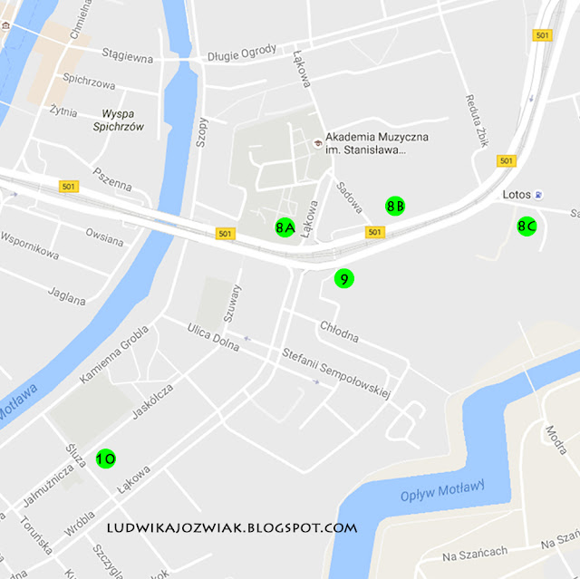 Poniższa mapa, opracowana na podstawie map google, przedstawia wybrane miejsca, o których opowiadała Pani Przewodniczka podczas spaceru. Przedstawiony przeze mnie wybór jest całkowicie subiektywny :) Numeracja stanowi kontynuację poprzedniego postu: Spacer po Dolnym Mieście w Gdańsku śladami historii (część pierwsza i nie ostatnia).
